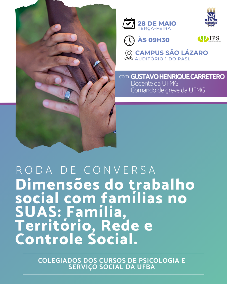 Convidamos a toda comunidade UFBA para participar da Roda de Conversa com o Docente de psicologia da UFMG, Gustavo Henrique Carretero. O evento ocorrerá no Campus São Lázaro, no Auditório 1 do PASL,no dia de hoje (28.05) a partir das 09h30. O evento está sendo organizado pelos colegiados dos cursos de Psicologia e Serviço Social da UFBA.